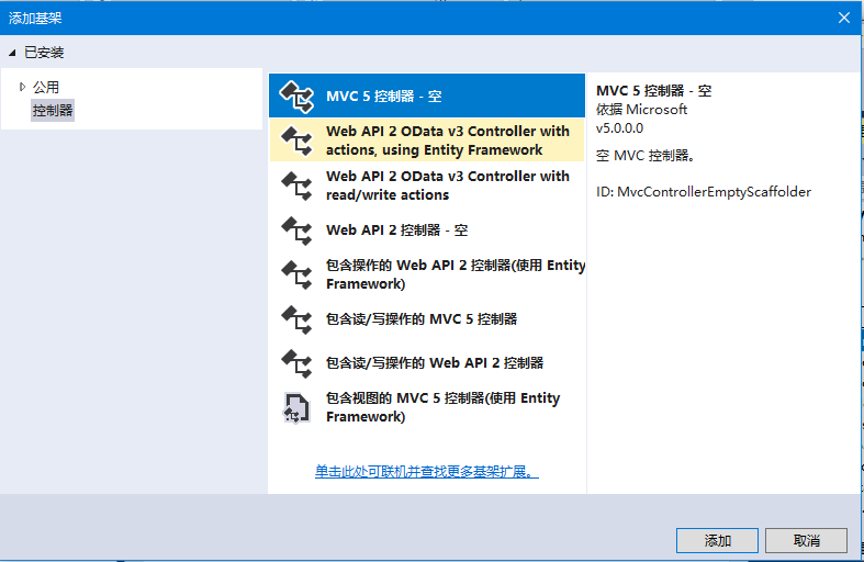 第3步 - 選擇MVC 5控制器 - 空選項,然后單擊“添加” 按鈕。添加控制器對話框將出現(xiàn)。