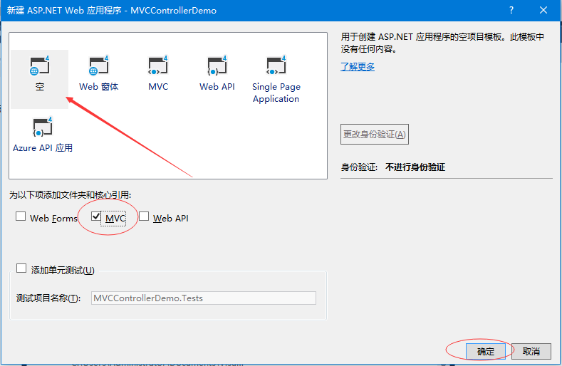 第5步 - 為了簡單起見,選擇空 選項,并在“為以下項添加文件夾和核心引用”部分選中MVC復(fù)選框,然后單擊【確定】。
