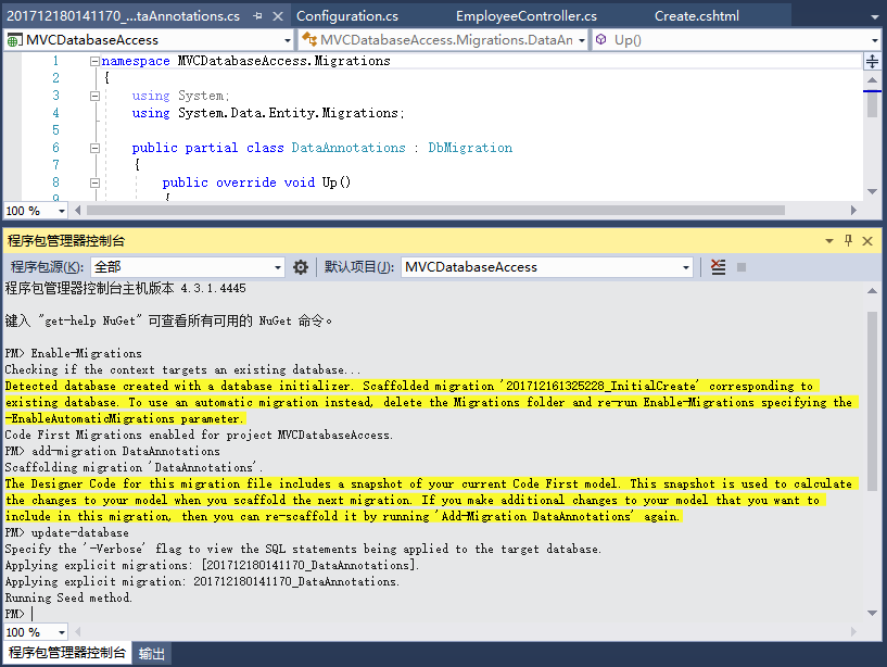 Visual Studio也將打開(kāi)從DbMIgration類(lèi)派生的類(lèi),可以在其中看到更新Up方法中的模式約束的代碼 -