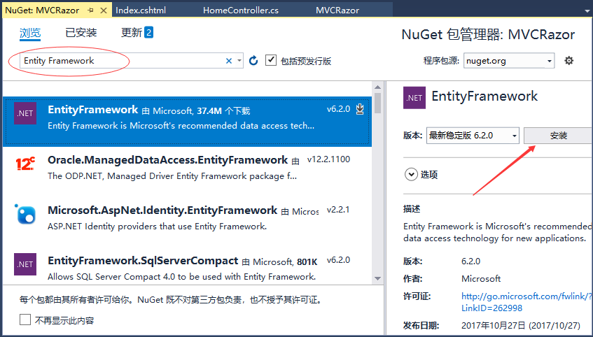 第2步 - 在搜索框中搜索實體框架 - Entity Framework ,結(jié)果如下-