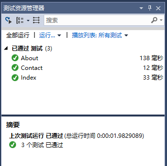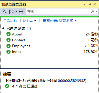 這三個方法將測試Index,About和Contact操作方法是否正常工作。要測試這三個操作方法,請轉(zhuǎn)到測試 菜單。選擇:運行 -> 所有測試 項來測試這些操作方法。