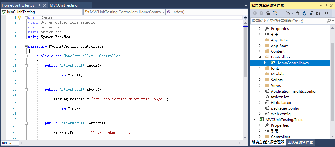 展開MVCUnitTestingDemo.Tests 項目,Controllers文件夾下的HomeControllerTest.cs文件。