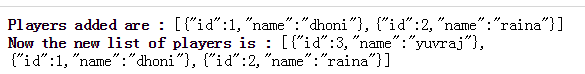 <!DOCTYPE html> <head> <title>Collection Example</title> <script src="https://code.jquery.com/jquery-2.1.3.min.js" type="text/javascript"></script> <script src="https://cdnjs.cloudflare.com/ajax/libs/underscore.js/1.8.2/underscore-min.js" type="text/javascript"></script> <script src="https://cdnjs.cloudflare.com/ajax/libs/backbone.js/1.1.2/backbone-min.js" type="text/javascript"></script> </head> <body> <script type="text/javascript"> //The model name is 'Player' and contains default values var Player = Backbone.Model.extend({ defaults: { id:"", name: "" } }); //'PlayersCollection' is an instance of the collection var PlayersCollection = Backbone.Collection.extend({ model: Player //model 'Player' is specified by using model property }); var player1 = new Player({id:1, name: "dhoni" }); var player2 = new Player({id:2, name: "raina"}); //The add() method adds the models 'player1' and 'player2' to the collection instance 'mycollection' var mycollection = new PlayersCollection(); mycollection.add([player1,player2]); document.write('<b>Players added are :</b> ' + JSON.stringify(mycollection.toJSON())); var player3 = new Player({id:3, name: "yuvraj" }); //Here, adding the model 'player3' at 0th index of the collection mycollection.add(player3,{at:0}); //display all the models added. player3 will be added at the 0th position document.write('<br><b>Now the new list of players is :</b> ' + JSON.stringify(mycollection.toJSON())); </script> </body> </html>