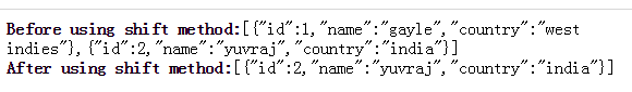 <!DOCTYPE html> <head> <title>Collection Example</title> <script src="https://code.jquery.com/jquery-2.1.3.min.js" type="text/javascript"></script> <script src="https://cdnjs.cloudflare.com/ajax/libs/underscore.js/1.8.2/underscore-min.js" type="text/javascript"></script> <script src="https://cdnjs.cloudflare.com/ajax/libs/backbone.js/1.1.2/backbone-min.js" type="text/javascript"></script> </head> <body> <script type="text/javascript"> //'Player' is a model and contains defualt values for the model var Player = Backbone.Model.extend({ defaults: { name: 'sachin', country: 'india' } }); //'Players' is an instance of the collection var Players = Backbone.Collection.extend({ model: Player }); //Instantiate the models along with "new" keyword and store them in the collection instance var player1 = new Player({ id: 1, name: 'gayle', country: 'west indies'}); var player2 = new Player({ id: 2, name: 'yuvraj', country: 'india'}); var teamArray = [player1, player2]; document.write("<b>Before using shift method:</b>",JSON.stringify(teamArray)); //The shift() method removes the model 'player1' from the collection teamArray.shift(); //The 'players' is the collection instance and contains array of models var players = new Players(teamArray); document.write("<br><b>After using shift method:</b>",JSON.stringify(players)); </script > </body> </html>