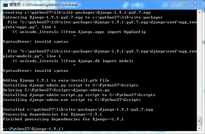 在某些版本的Windows(Windows7)中,可能需要保證Path系統(tǒng)變量的路徑如下,C:\Python27\;C:\Python27\Lib\site-packages\django\bin\ , 當(dāng)然這取決于你的Python版本。