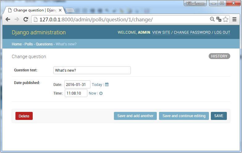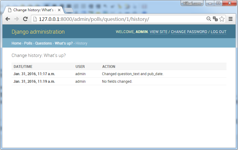 修改“Date published”點(diǎn)擊“Today”和“Now”快捷方式。然后點(diǎn)擊“Save and continue editing.”,然后點(diǎn)擊“History”在右上角。你會看到一個(gè)頁面,列出通過Django管理到這個(gè)對象的所有變化,修改人用戶名和時(shí)間戳: