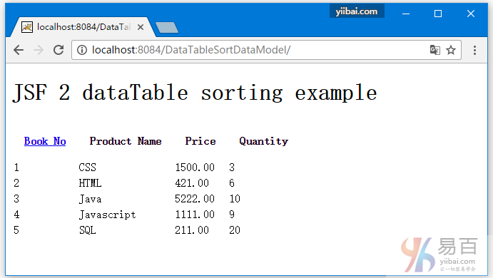 JSF中有一個叫作DataTable的控件,可用來渲染和格式化html表格。使用DataTable,我們可以迭代收集或數(shù)組數(shù)組來顯示數(shù)據(jù)。下面我們來學(xué)習(xí)如何向DataTable使用DataModel排序數(shù)據(jù)。