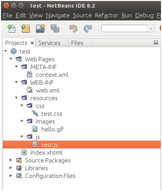 <h:outputScript>標(biāo)簽用于訪問Web應(yīng)用程序中的JavaScript文件。 以下截圖顯示了項(xiàng)目中JavaScript文件的位置。