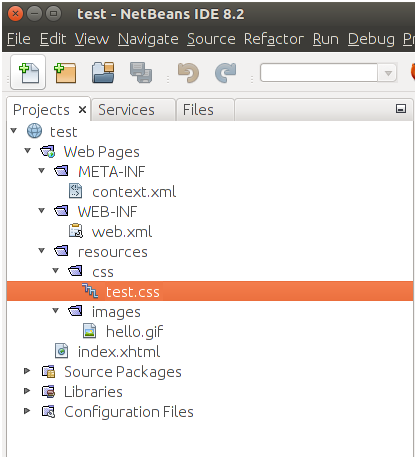 在以下示例中,訪問網(wǎng)頁中的test.css文件。文件: index.xhtml 的代碼如下所示-