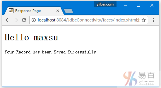 運(yùn)行上面項(xiàng)目,打開瀏覽器訪問:http://localhost:8084/JdbcConnectivity/,并提交表單,向數(shù)據(jù)庫表中寫入數(shù)據(jù) -