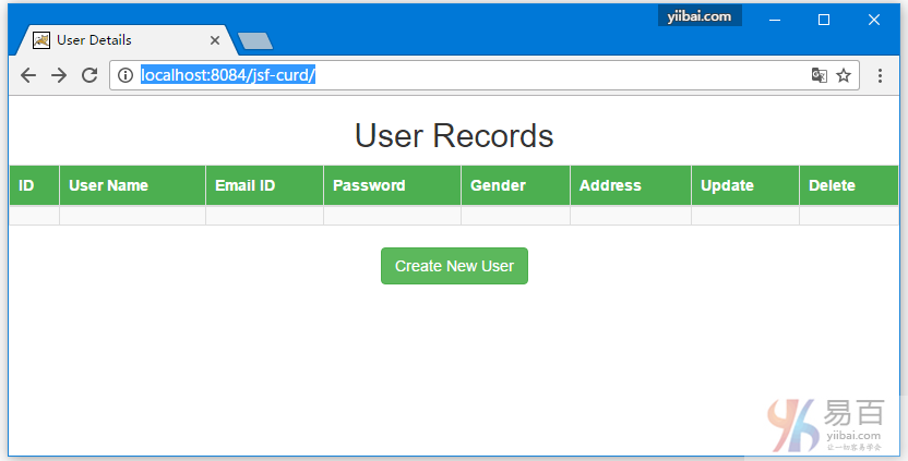 這是應用程序的入口頁面(index.xhtml)。 運行該項目后,會從mysql的test數(shù)據(jù)庫的users表中讀取數(shù)據(jù)來填充表格,在 Tomcat 啟動完成后,打開瀏覽器訪問以下網(wǎng)址: