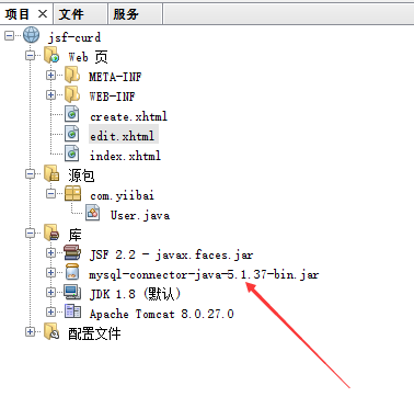 打開 NetBeans IDE,創(chuàng)建一個名稱為:jsf-curd 的 Web 工程,其目錄結構如下所示 -