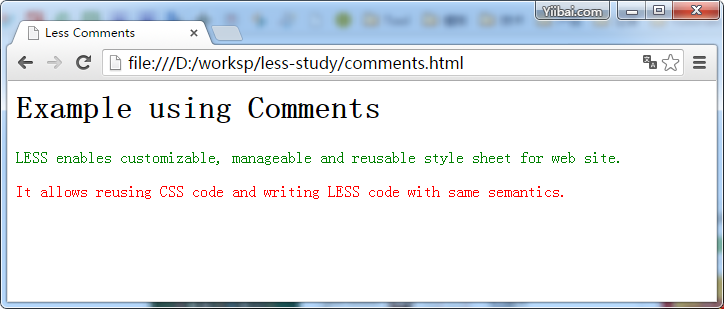 <html> <head> <title>Less Comments</title> <link rel="stylesheet" type="text/css" href="style.css" /> </head> <body> <h1>Example using Comments</h1> <p class="myclass">LESS enables customizable, manageable and reusable style sheet for web site.</p> <p class="myclass1">It allows reusing CSS code and writing LESS code with same semantics.</p> </body> </html>