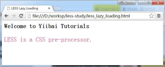 <html> <head> <link rel="stylesheet" href="style.css" type="text/css" /> <title>LESS Lazy Loading</title> </head> <body> <h2>Welcome to Yiibai Yiibai</h2> <p>LESS is a CSS pre-processor.</p> </body> </html>