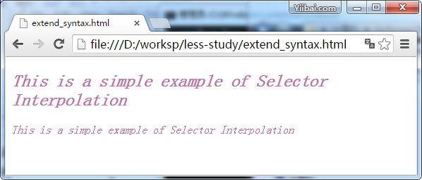 <!doctype html> <head> <link rel="stylesheet" href="style.css" type="text/css" /> </head> <body> <h2 class="style">This is a simple example of Selector Interpolation</h2> <p class="style">This is a simple example of Selector Interpolation</p> </body> </html>