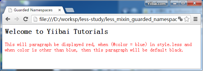 <html> <head> <link rel="stylesheet" href="style.css" type="text/css" /> <title>Guarded Namespaces</title> </head> <body> <h2>Welcome to Yiibai Yiibai</h2> <p>This will paragraph be displayed red, when (@color = blue) in style.less and when color is other than blue, then this paragraph will be default black.</p> </body> </html>