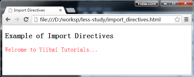 <!doctype html> <head> <title>Import Directives</title> <link rel="stylesheet" href="style.css" type="text/css" /> </head> <body> <h2>Example of Import Directives</h2> <p class="myline">Welcome to Yiibai Tutorials...</p> </body> </html>