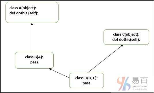 上圖將被視為含糊不清。 從上之前的例子中了解“方法解析順序”。 mro將是D→B→A→C→A,但事實并非如此。 在從C獲得第二個A時,Python將忽略之前的A。因此在這種情況下mro將是D→B→C→A。