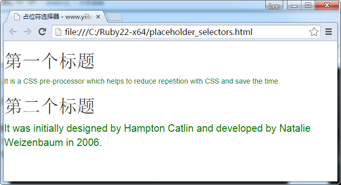 <html> <head> <meta http-equiv="Content-Type" content="text/html; charset=utf-8"> <title>占位符選擇器 - www.yiibai.com</title> <link rel="stylesheet" type="text/css" href="style.css" /> <link rel="stylesheet" > <script src="https://ajax.googleapis.com/ajax/libs/jquery/2.1.3/jquery.min.js"></script> <script src="https://maxcdn.bootstrapcdn.com/bootstrap/3.3.5/js/bootstrap.min.js"></script> </head> <body> <h1>第一個標(biāo)題</h1> <p class="frst_para">It is a CSS pre-processor which helps to reduce repetition with CSS and save the time. </p> <h1>第二個標(biāo)題</h1> <p class="sec_para">It was initially designed by Hampton Catlin and developed by Natalie Weizenbaum in 2006.</p> </body> </html>
