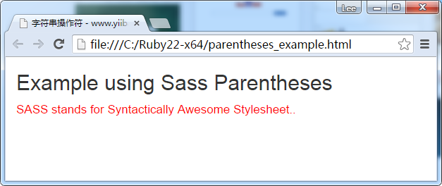 <html> <head> <title>字符串操作符 - www.yiibai.com</title><meta http-equiv="Content-Type" content="text/html; charset=utf-8"> <link rel="stylesheet" type="text/css" href="style.css" /> <link rel="stylesheet" > <script src="https://ajax.googleapis.com/ajax/libs/jquery/2.1.3/jquery.min.js"></script> <script src="https://maxcdn.bootstrapcdn.com/bootstrap/3.3.5/js/bootstrap.min.js"></script> </head> <body> <div class="container"> <h2>Example using Sass Parentheses</h2> <p>SASS stands for Syntactically Awesome Stylesheet..</p> </div> </body> </html>