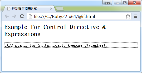 <html> <head> <meta charset="utf-8"> <title>控制指令和表達式</title> <link rel="stylesheet" type="text/css" href="style.css"/> </head> <body> <div class="container"> <h2>Example for Control Directive & Expressions</h2> <p>SASS stands for Syntactically Awesome Stylesheet. </p> </div> </body> </html>