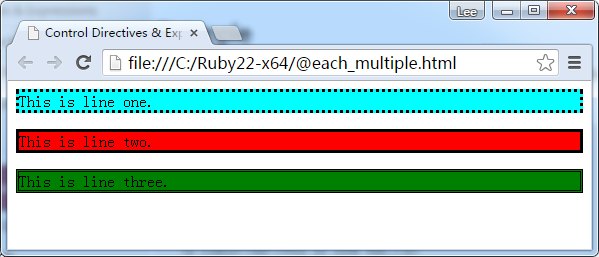 <html> <head> <title>Control Directives & Expressions</title> <link rel="stylesheet" type="text/css" href="style.css"/> </head> <body> <p class="aqua">This is line one.</p> <p class="red">This is line two.</p> <p class="green">This is line three.</p> </body> </html>