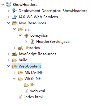 打開Eclipse,創(chuàng)建一個(gè)動(dòng)態(tài)Web項(xiàng)目:ShowHeaders,并在com.yiibai包下創(chuàng)建一個(gè)名稱為:HeaderServlet.java的Servlet類以及在WebContent目錄下創(chuàng)建一個(gè)HTML文件:index.html,如下所示 -