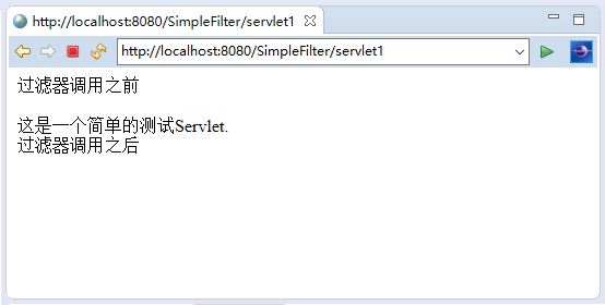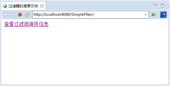 在編寫上面代碼后,部署此Web應(yīng)用程序(在項(xiàng)目名稱上點(diǎn)擊右鍵->”Run On Server…”),打開瀏覽器訪問URL: http://localhost:8080/SimpleFilter/ ,如果沒有錯(cuò)誤,應(yīng)該會(huì)看到以下結(jié)果 -