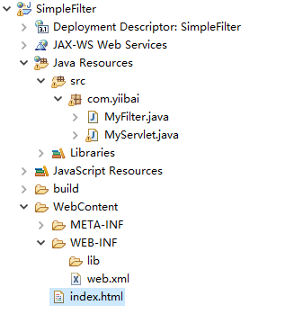 打開Eclipse,創(chuàng)建一個(gè)動(dòng)態(tài)Web項(xiàng)目:SimpleFilter,其完整的目錄結(jié)構(gòu)如下所示 -