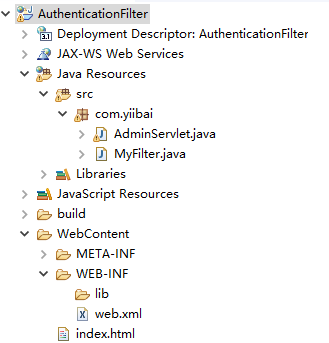 打開Eclipse,創(chuàng)建一個動態(tài)Web項目:AuthenticationFilter,其完整的目錄結構如下所示 -
