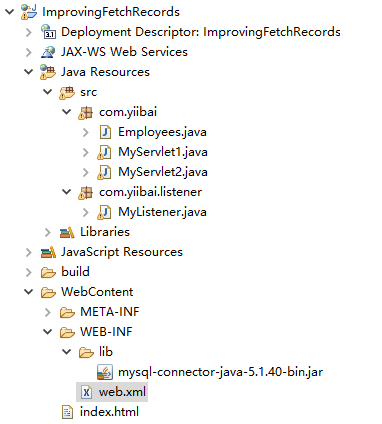 bean類,包含幾個(gè)屬性及其getter和setter方法,此類用于表示數(shù)據(jù)庫(kù)表:employees。打開Eclipse,創(chuàng)建一個(gè)動(dòng)態(tài)Web項(xiàng)目:ImprovingFetchRecords,其完整的目錄結(jié)構(gòu)如下所示 -