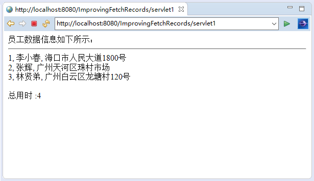 在編寫上面代碼后,部署此Web應(yīng)用程序(在項(xiàng)目名稱上點(diǎn)擊右鍵->”Run On Server…”),打開瀏覽器訪問URL: http://localhost:8080/ImprovingFetchRecords/ ,如果沒有錯(cuò)誤,應(yīng)該會(huì)看到以下結(jié)果 -