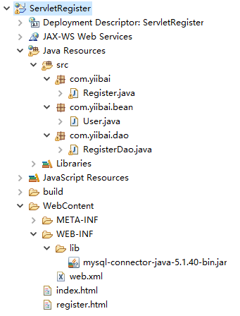 打開Eclipse,創(chuàng)建一個(gè)動(dòng)態(tài)Web項(xiàng)目:ServletRegister,其完整的目錄結(jié)構(gòu)如下所示 -