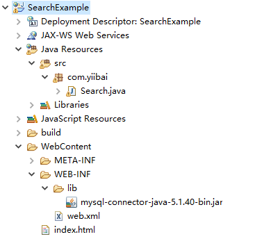 打開Eclipse,創(chuàng)建一個動態(tài)Web項目:SearchExample,其完整的目錄結(jié)構(gòu)如下所示 -