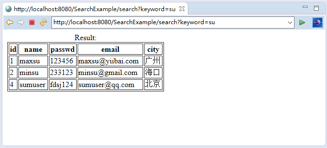 在編寫上面代碼后,部署此Web應(yīng)用程序(在項目名稱上點擊右鍵->”Run On Server…”),打開瀏覽器訪問URL: http://localhost:8080/SearchExample/ ,如果沒有錯誤,應(yīng)該會看到以下結(jié)果 -