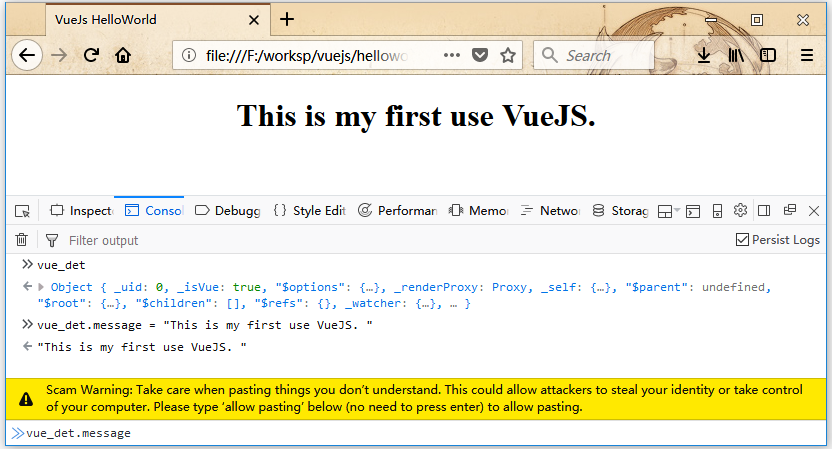 在上面的控制臺(tái)中,已經(jīng)打印了Vue實(shí)例的vue_det對(duì)象。并用"This is my first use VueJS."字符串更新這個(gè)消息,并且立即在瀏覽器中修改這個(gè)消息,就像上面的截圖一樣。