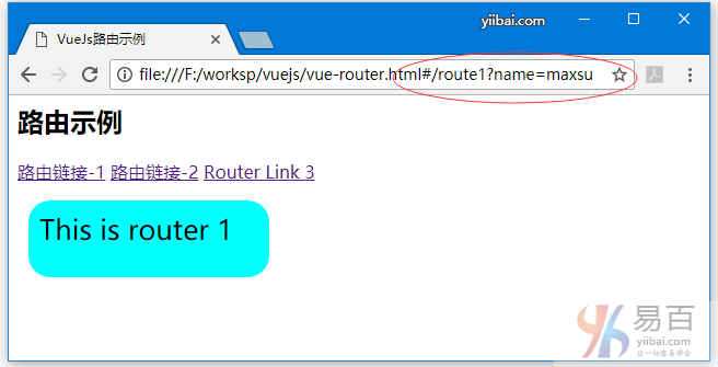 在URL路徑中,name=maxsu是查詢字符串的一部分。 例如:http://localhost/vueexamples/vue_router.html#/route1?name=maxsu