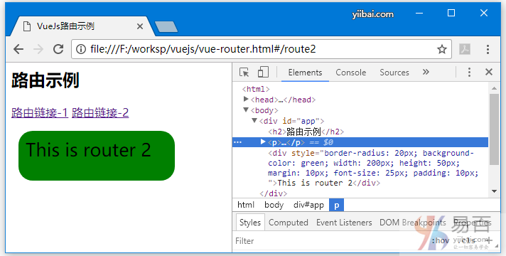 const Route2 = { template: '<div style = "border-radius:20px;background-color:green;width:200px;height:50px;margin:10px;font-size:25px;padding:10px;">This is router 2</div>' }