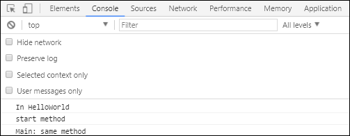 如上所示,已經(jīng)調(diào)用了helloworld,start和same方法。 同樣的方法也存在于mixin中,但優(yōu)先級將賦予主實(shí)例,如下面的控制臺所示。