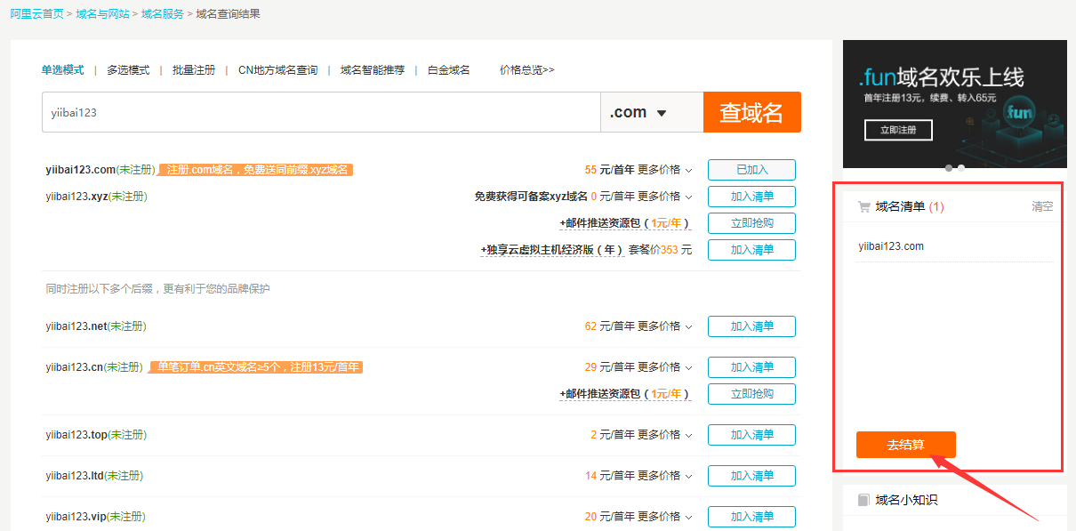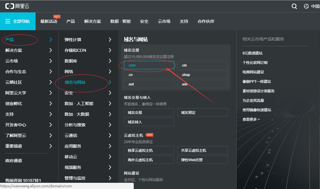 注冊域名很簡單,只要花錢就好了,也不貴,.com 的域名首年是45塊(推薦使用:.com的域名),最新出來的top域名10塊都不到,首先打開網(wǎng)址:http://www.aliyun.com/ , 域名注冊請點擊,參考下面圖 -