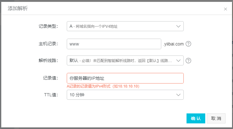 注意: 上面添加的解析,并不能馬上生效,TTL值 指定生效的時間,在這個選項選中的是 10分鐘,表示需要添加提交10分鐘后才能生效。