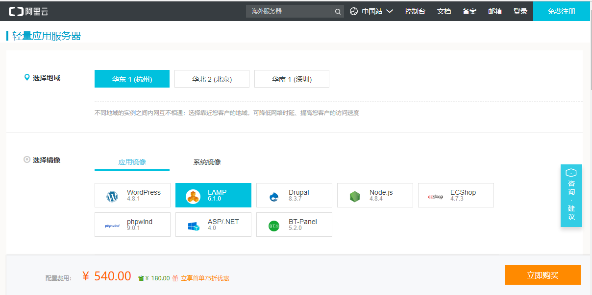輕量應(yīng)用服務(wù)器 :http://common-buy.aliyun.com/?spm=5176.8064714.850240.pricedetail1111.7da62946Mv8XAQ&commodityCode=swas ,如下圖所示 -