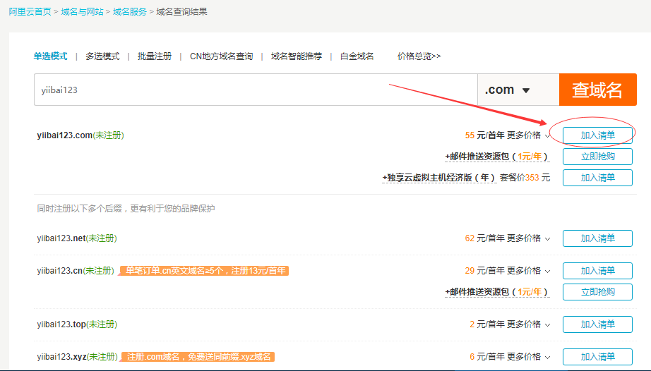 查詢你想要注冊的域名,比如:yiibai123.com,只需要輸入yiibai123搜索即可,為什么還要搜索?這是因為有的域名可能已經(jīng)被別人注冊了,只要別人還沒有注冊你都可以注冊。搜索結(jié)果如下所示 -