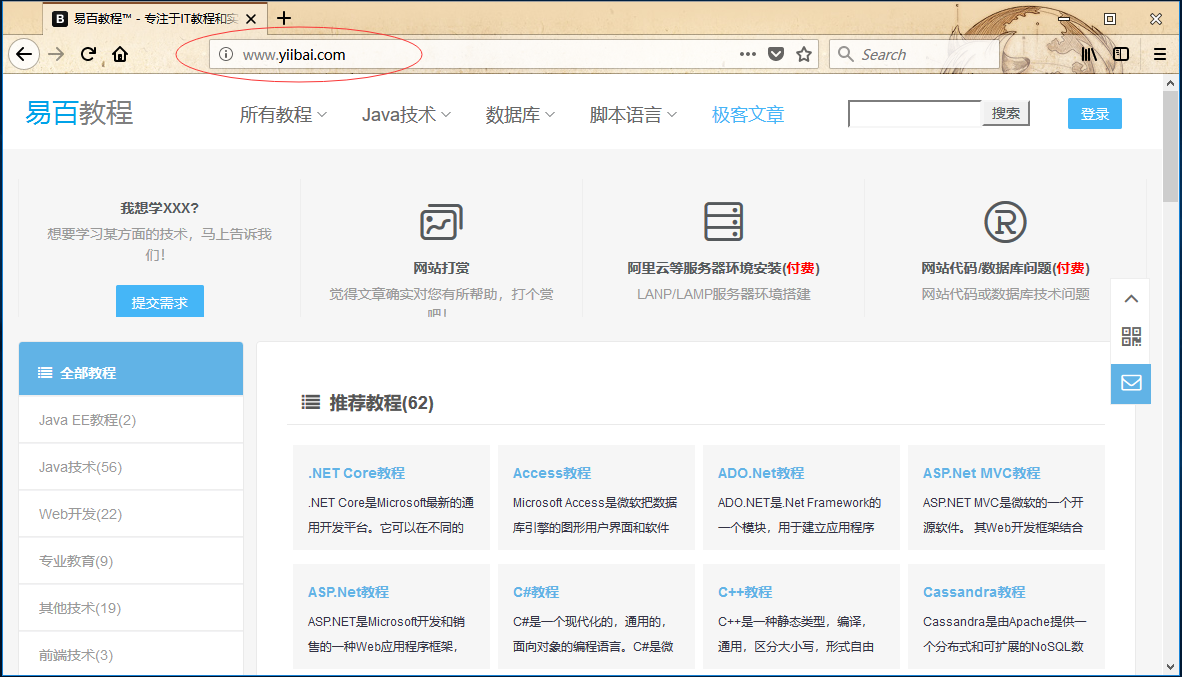一個網(wǎng)站可以被定義為多個相互關(guān)聯(lián)的網(wǎng)頁的集合,并且可以通過使用諸如Internet Explorer,Mozilla,Google Chrome或Opera的瀏覽器訪問主頁來訪問。 例如,易百教程的網(wǎng)站地址是 - www.yiibai.com ,打開后顯示如下圖 -