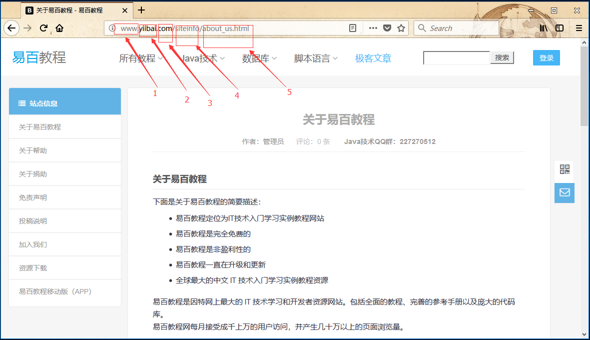 每個網(wǎng)站都有自己的URL,這是一個唯一的全球地址,稱為域名。 一個URL包含(例如:http://www.yiibai.com/siteinfo/about_us.html) -