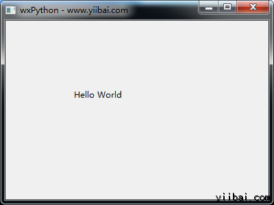 import wx app = wx.App() window = wx.Frame(None, title = "wxPython - www.yiibai.com", size = (400,300)) panel = wx.Panel(window) label = wx.StaticText(panel, label = "Hello World", pos = (100,100)) window.Show(True) app.MainLoop()